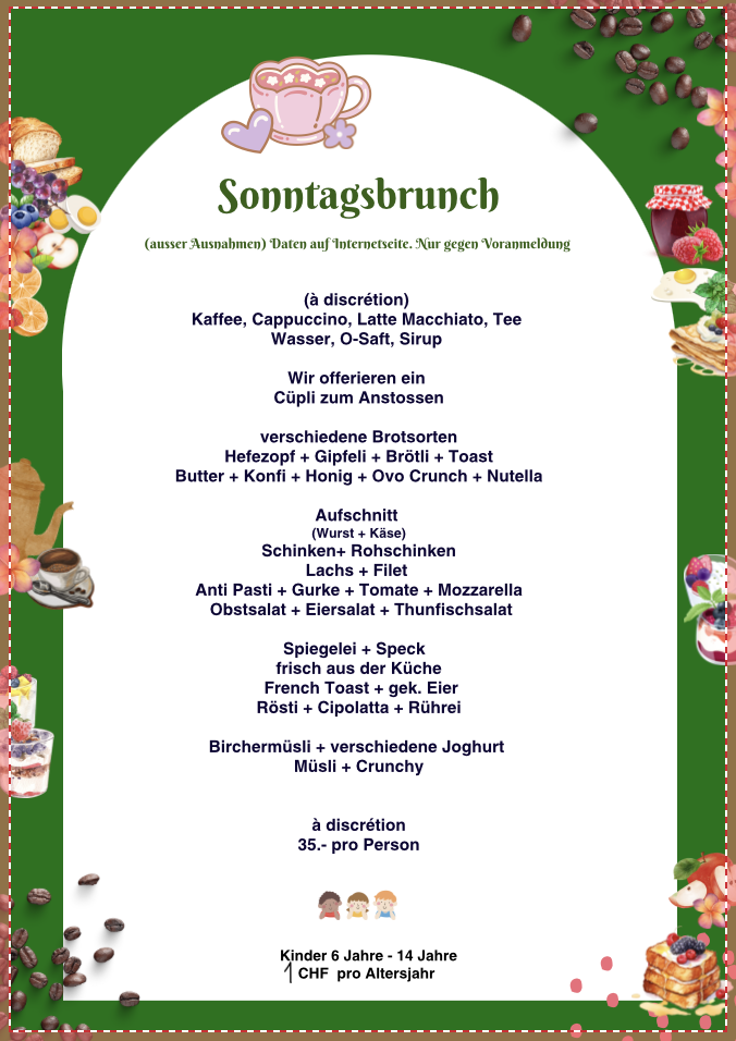 Sonntag | Sonntagsbrunch 10:00 - 13:00h bzw. ab 14:00h durchgehend bis 20:00h offen